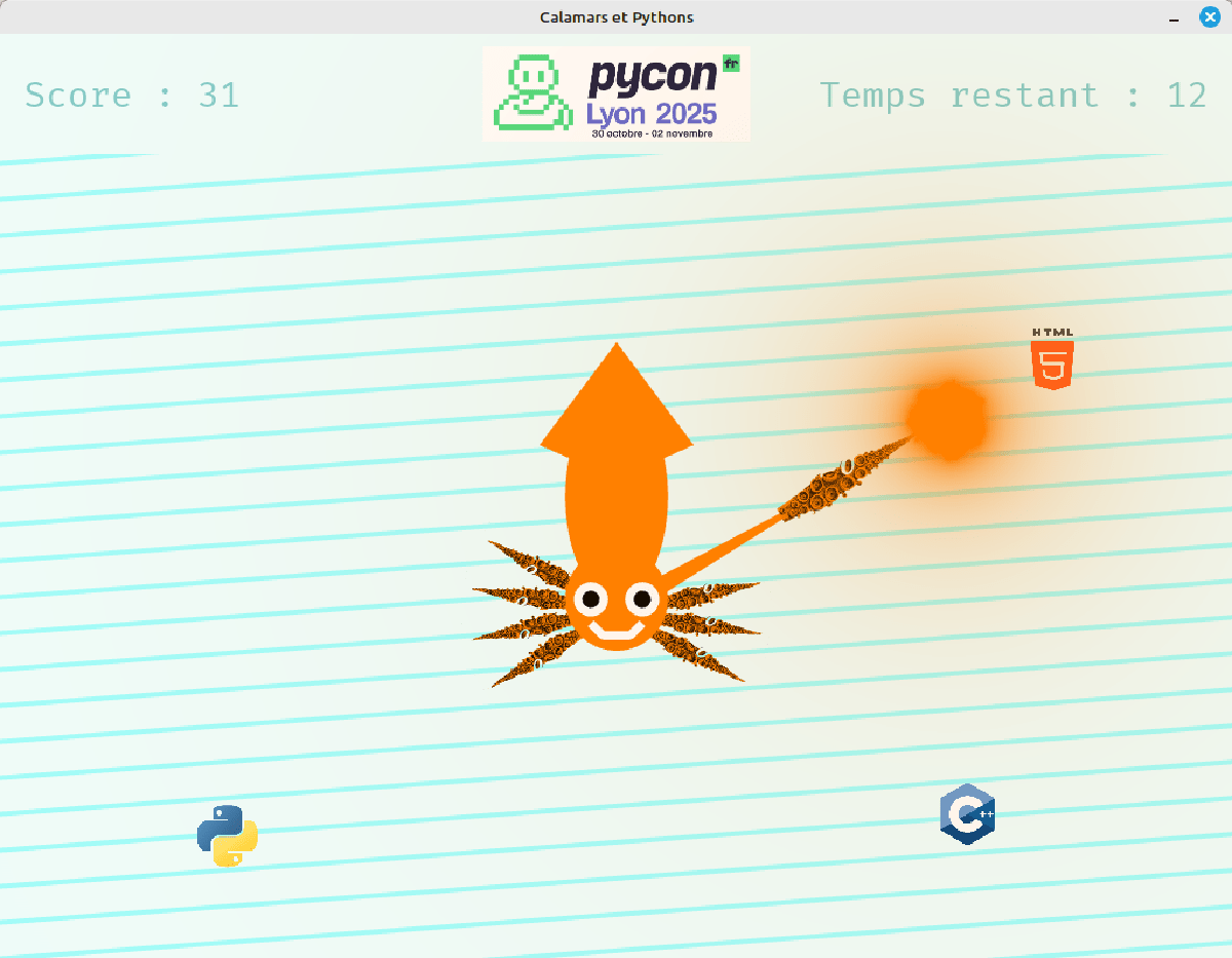 Elle est intitulée : « Calamars et Pythons : créons un jeu 2D avec arcade ». J’y parle beaucoup de calamar… Mais je vous ai déjà expliqué pourquoi ici.